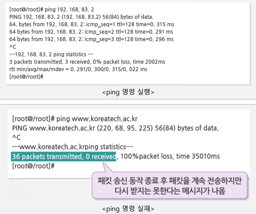 - ping 명령은 1초마다 패킷을 목적지 컴퓨터로 전송하고 다시 수신함으로써 네트워크에 접속되어 동작되는지 확인