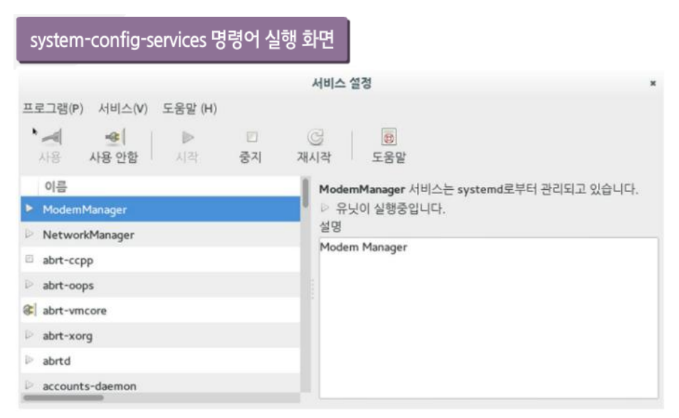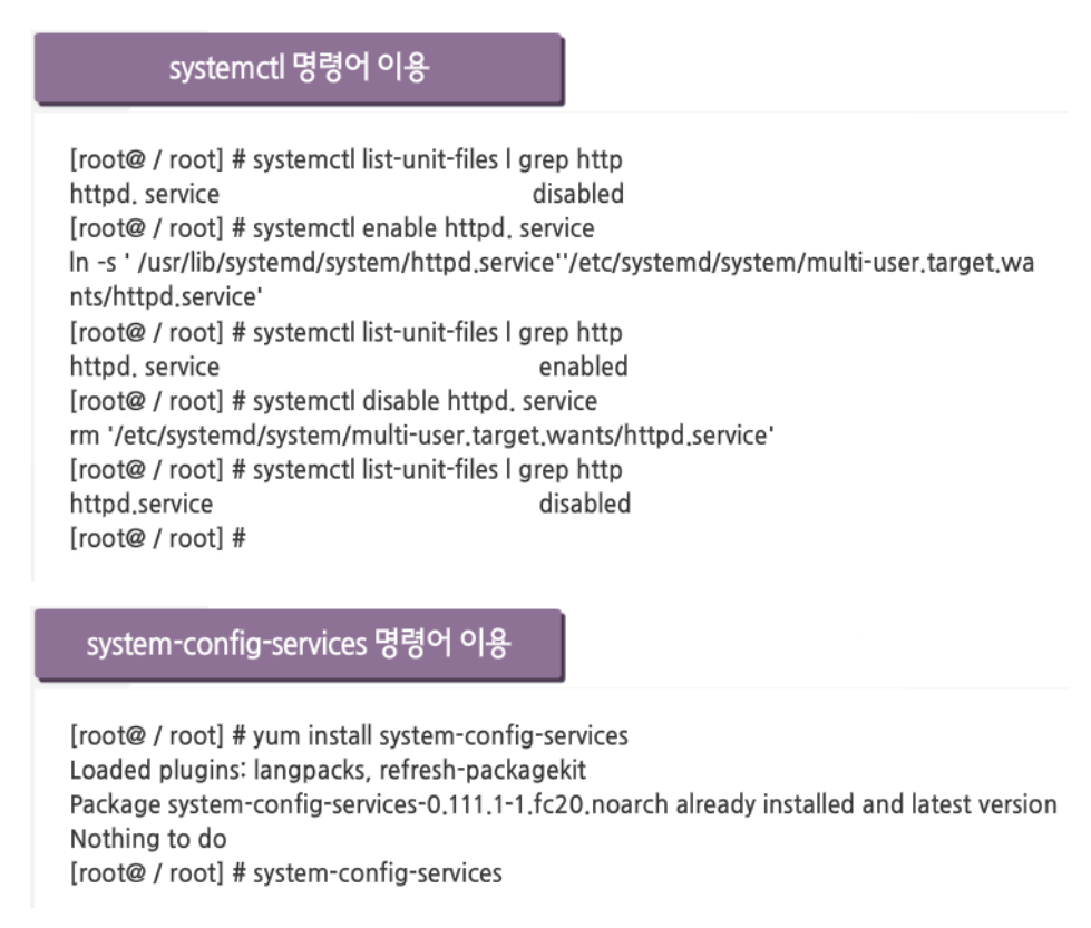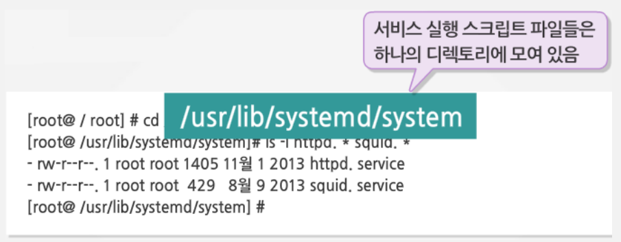 - 서비스 = 리눅스에서 필요한 여러 가지 동작을 하는 백그라운드 프로세스