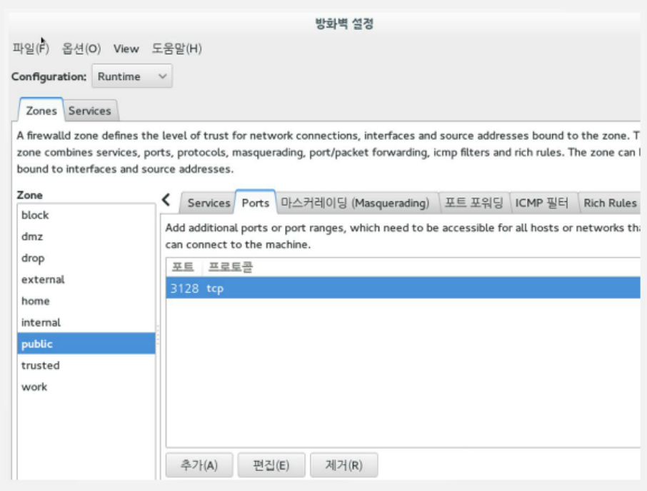 - 방화벽 설정 프로그램 실행을 위한 firewall-config 명령어 실행