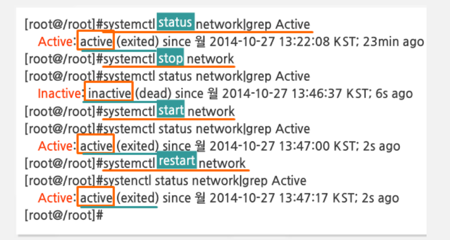 systemctl 명령인 start, stop, restart, status 옵션 실행 화면