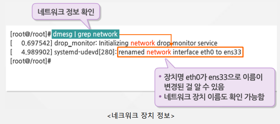 - 리눅스 부팅 시 나오는 메시지를 보는 명령으로, 네트워크 장치 이름을 확인 가능