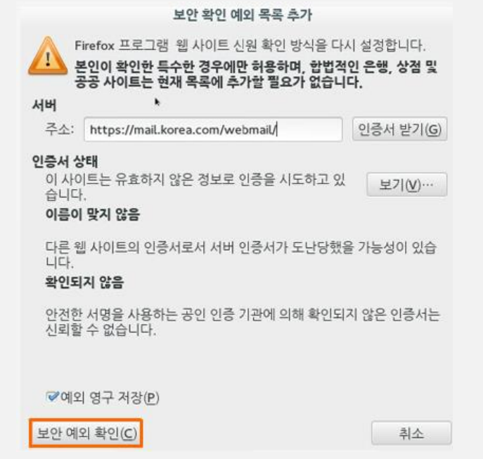 - [보안 예외 확인] 버튼 클릭