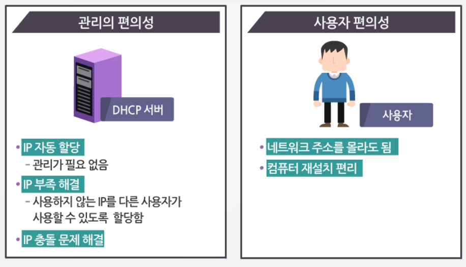 - IP주소, Subnet Mask, Gateway 주소, DNS 주소 등의 네트워크 정보 자동 할당