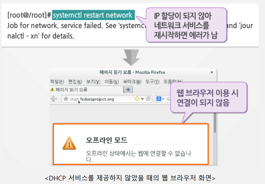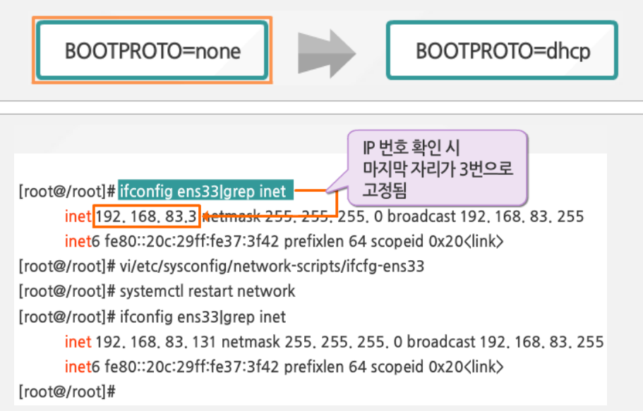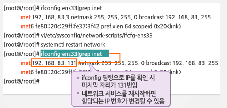 - 리눅스를 재부팅하거나, systemctl 명령으로 네트워크 서비스를 재시작함!