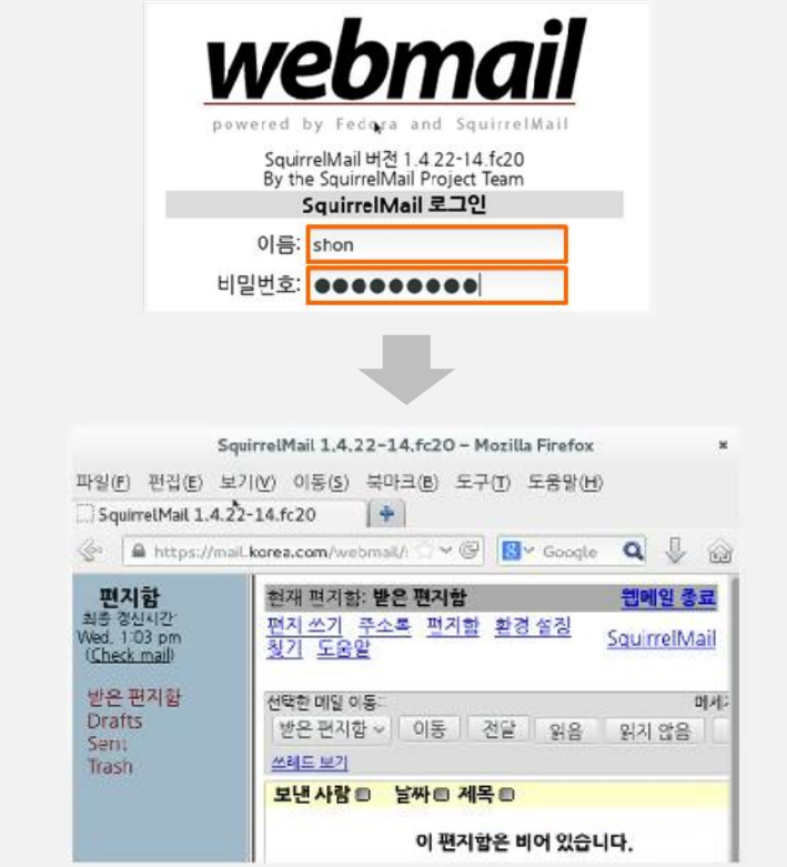 - 아이디와 비밀번호를 입력하여 로그인 진행 -> 웹 메일 접속 완료