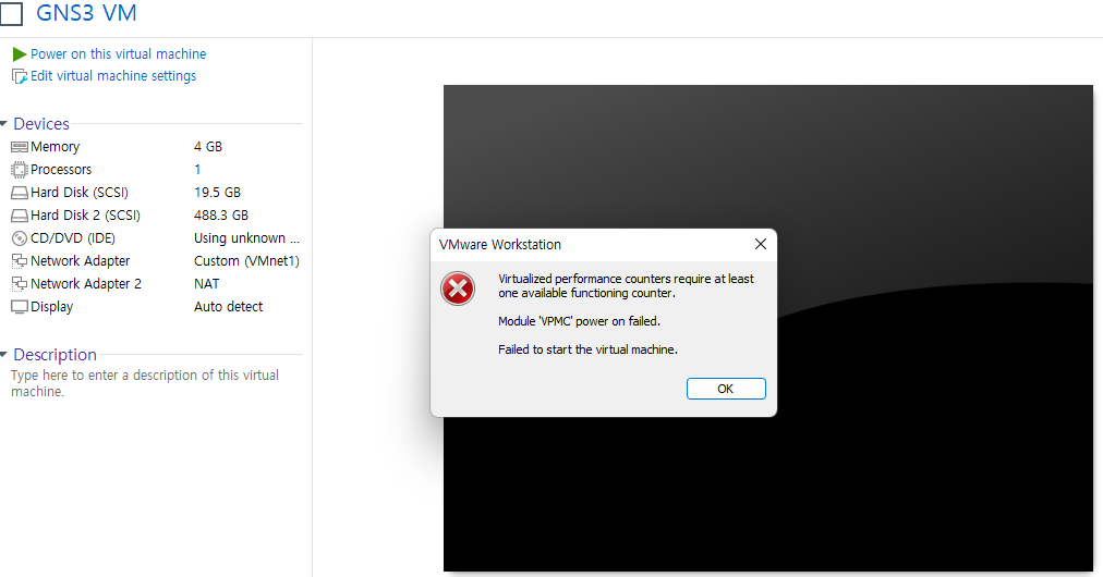 "가상화된 성능 카운터에는 사용 가능한 작동 카운터가 하나 이상 필요합니다. 모듈 'VPMC' 전원 켜기가 실패 했습니다. 가상 머신을 시작하지 못했습니다"