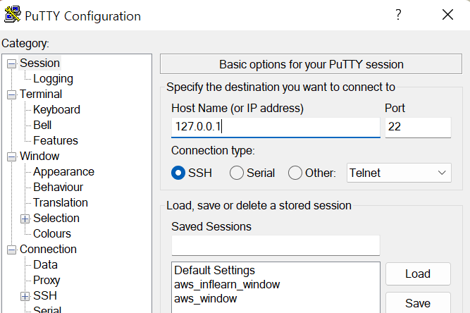 이제 putty에서 루프백주소로 접속하면 접속완료됨.