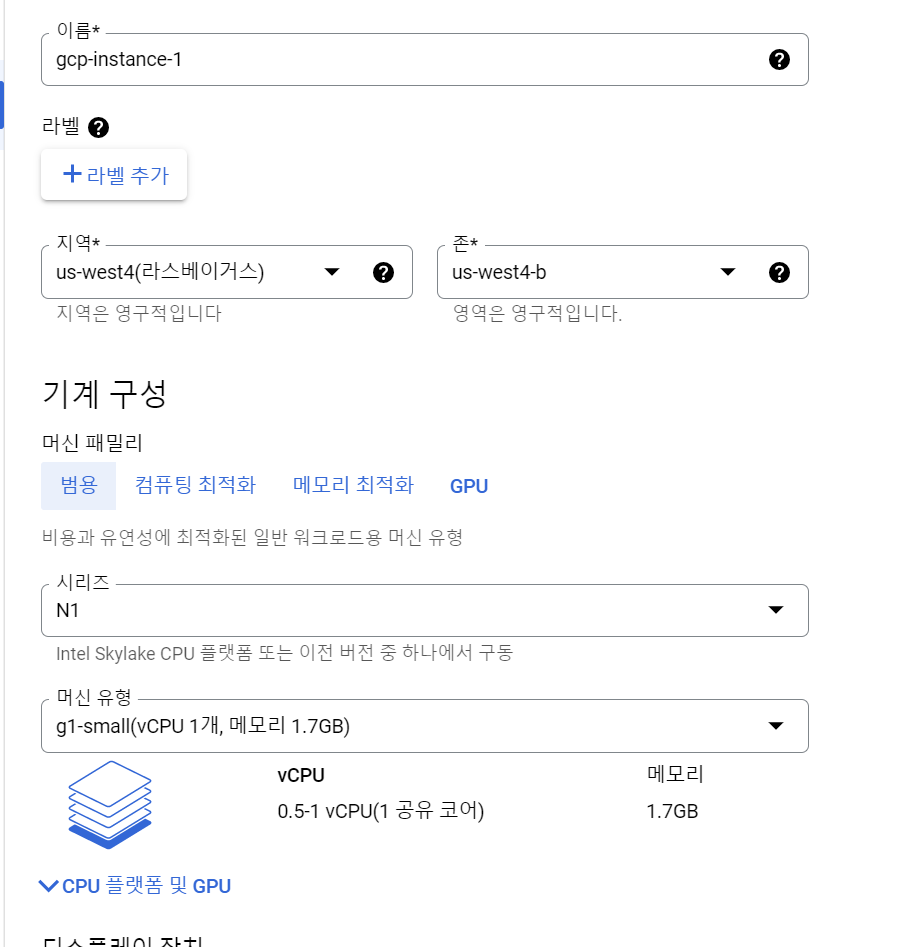 서버스펙은 N1 , 머신 유형은 g1-small로 변경