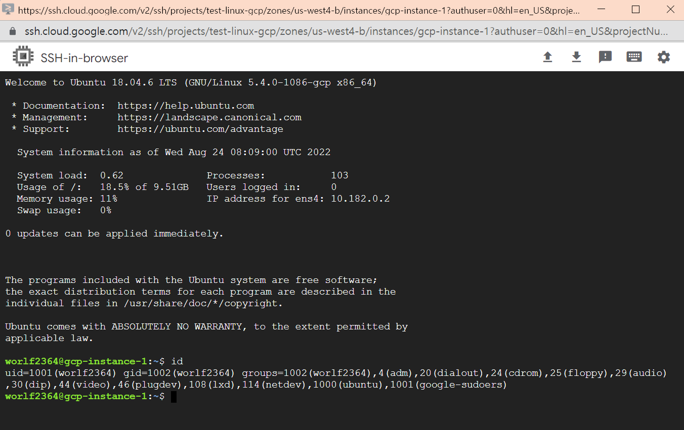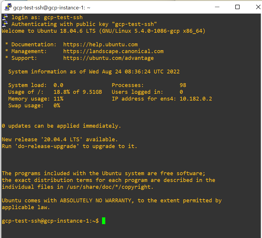gcp-test-ssh 입력하니 접속 완료!!