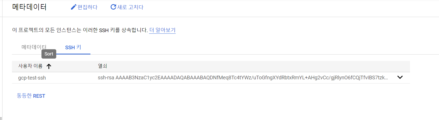 복사해주고 gcp로 들어가 메타데이터 탭에서 메타데이터 추가를 눌러준뒤