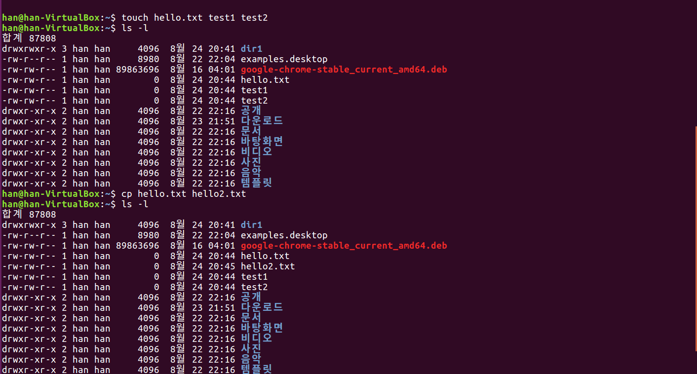 - touch .hello.txt = 히든파일 만들기 (맨 앞의 점. 위 hello.txt와 다른 파일임)