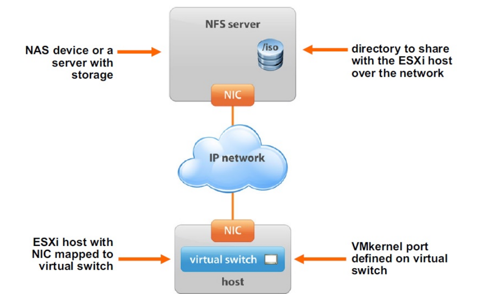 - NFS 디바이스에는 네트워크를 통해 ESXi 호스트와 공유되는 디렉토리가 포함됨.