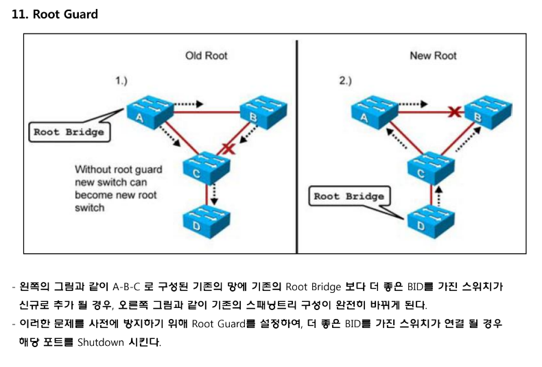 - Root Guard를 enable한 포트에 새로운 스위치가 붙었을 때 새로운 스위치가 Root Bridge-ID 보다 좋은 BID을 가지고 있으면, 해당 포트를 shutdown을 실시 한다.