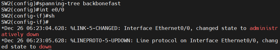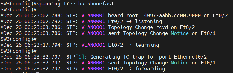 *Dec 26 06:01:44.436: %SPANTREE_FAST-7-PORT_FWD_UPLINK: VLAN0001 Ethernet0/2 moved to Forwarding (UplinkFast).