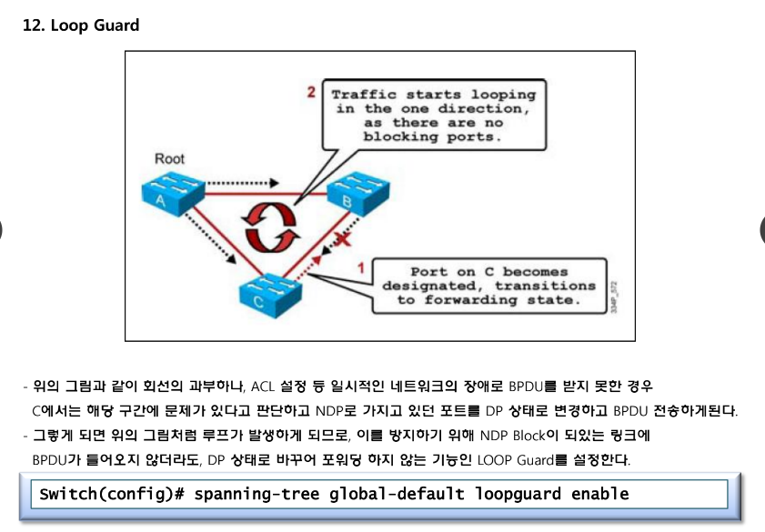 즉, 대체포트가 BPDU를 수신하지 못해도 차단상태를 전송상태로 변경하지 못하게 하면 되고, 이런 기능을 하는 것이 루프가드입니다.