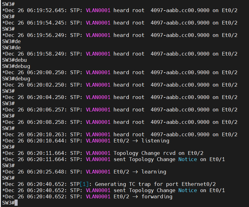 *Dec 26 06:01:55.655: STP: VLAN0001 Et0/1 -> listening