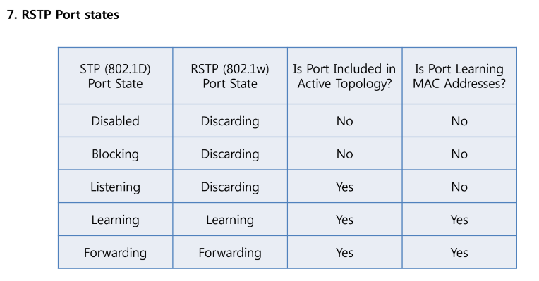 포트 역할을 결정하는 기준은 동일하지만 (Bridge-ID, Cost, Port-ID) 절차는 완전히 다릅니다. STP가 50초를 기다리는 이유는 바로 전송상태로 변경 시 프레임 루프가 발생할 수 있기 때문이죠.
