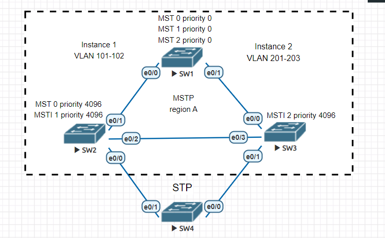SW1(config-mst)#instance 1 vlan 101-102
