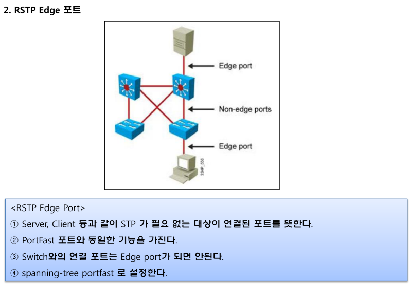 | edge | PC, server와 같이 stp가 동작하지 않는 종단 장치와 연결된 포트 Portfast를 설정해야만 edge 링크로 동작함. |