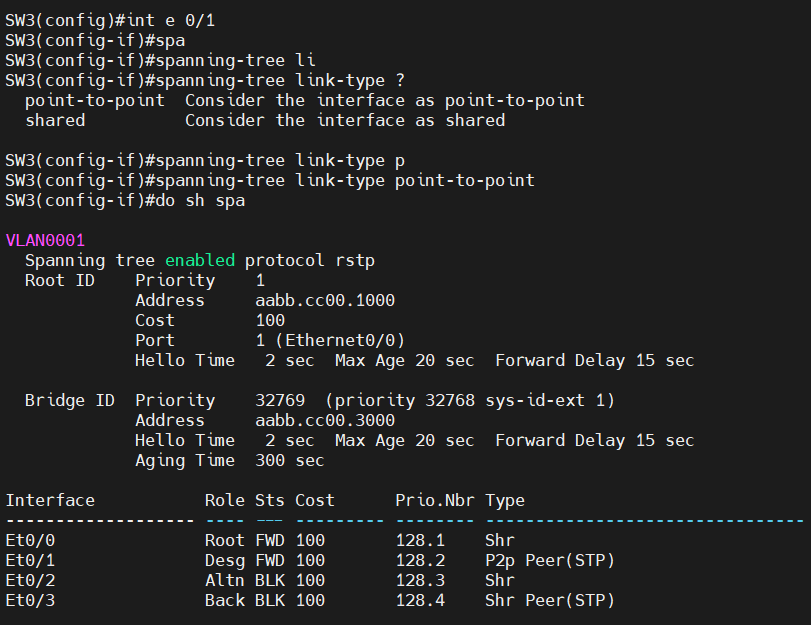 SW4가 외부 영역과 연결되고, e0/0 포트가 CIST 대체포트여서 차단상태에 있습니다.
