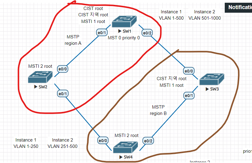 - MSTI 루트 스위치는 각 영역별로 인스턴스 수만큼 존재합니다.