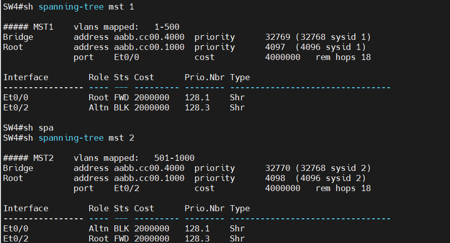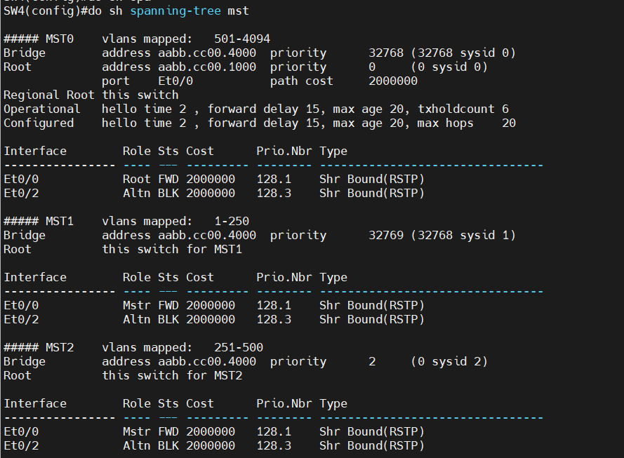 SW4(config)#spanning-tree mst 2 priority 0