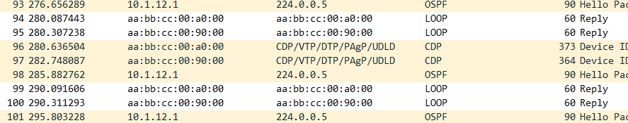 하지만, 와이어샤크에서는 hello packet은 여전히 올라오고 있다. OSPF 설정이 사라진건 아니기 떄문.