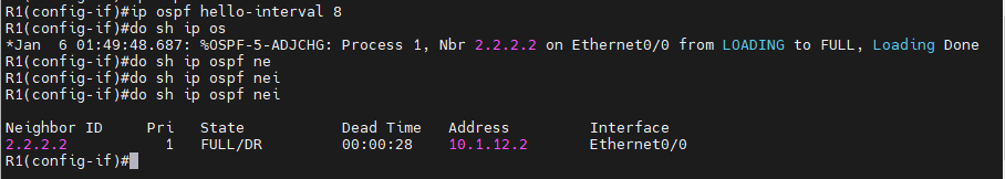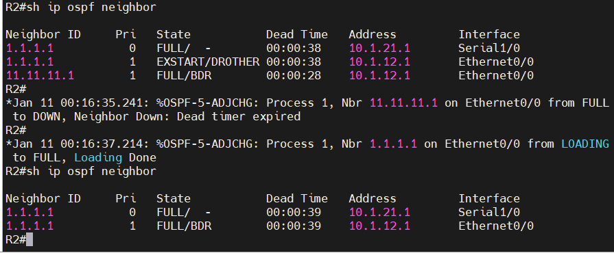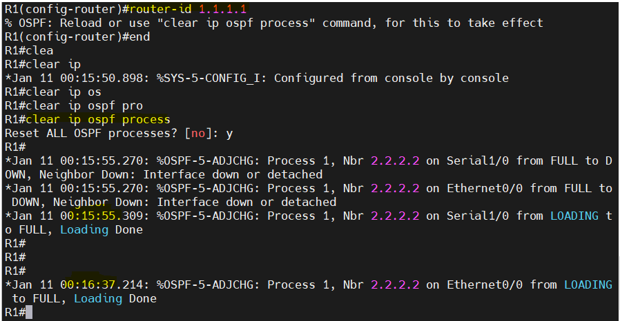 - R1의 Router ID를 1.1.1.1로 변경해 보세요, 확인은 R2에서 show ip ospf neighbor로 확인 하세요.