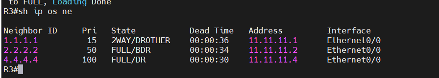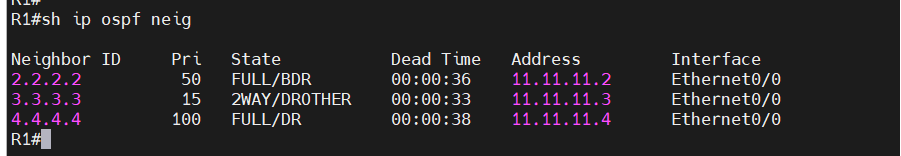 R2에서 show ip ospf neighbor로 보면, R1가 11.11.11.11로 보이는 이유는 무엇입니까?