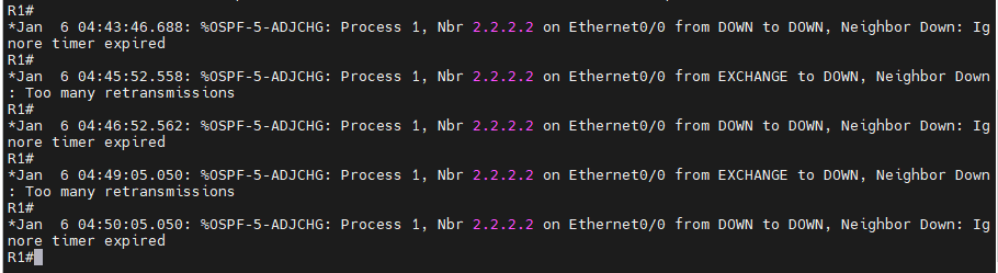 하지만, R1, R2의 상태 변화를 지켜보면 Down, Exchange, Exstart 상태들이 지속적으로 바뀐다.