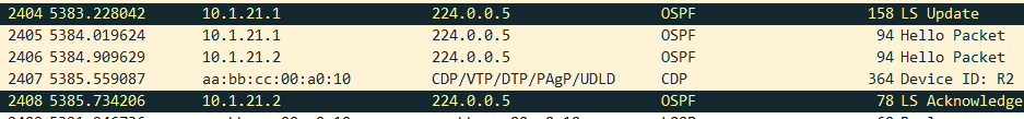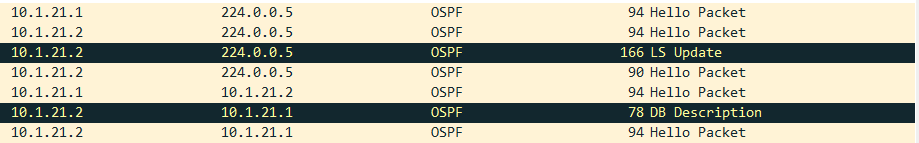 = 224.0.0.5 // 재시작시에는 10.1.21.1 / 10.1.21.2 가 SA/DA로 나오게 된다. (LS Update) - DBD (DB Description) Packet