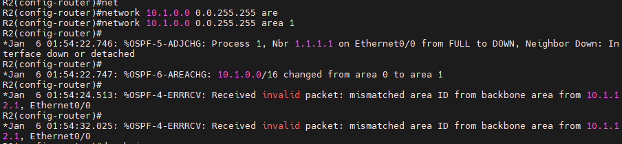 아래 그림처럼 Received invalid packet : mismatched area ID from backbone area from 10.1.12.1 e0/0이 뜨면서