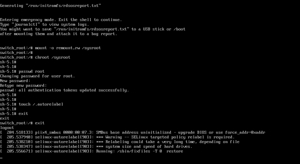 다음으로는 레이블이 없는 모든 파일(/etc/shadow 포함)이 부팅 중 다시 레이블이 지정되도록 한다.