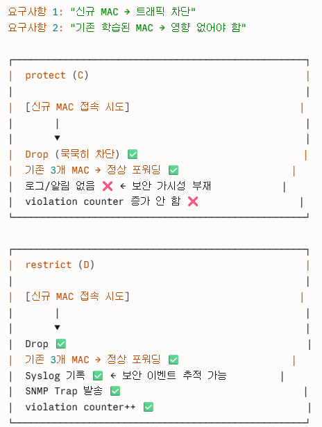 - 기존 mac 영향 없이 허용되지 않은 MAC 주소 차단 및 로그 기록 - switchport port-security violation protect