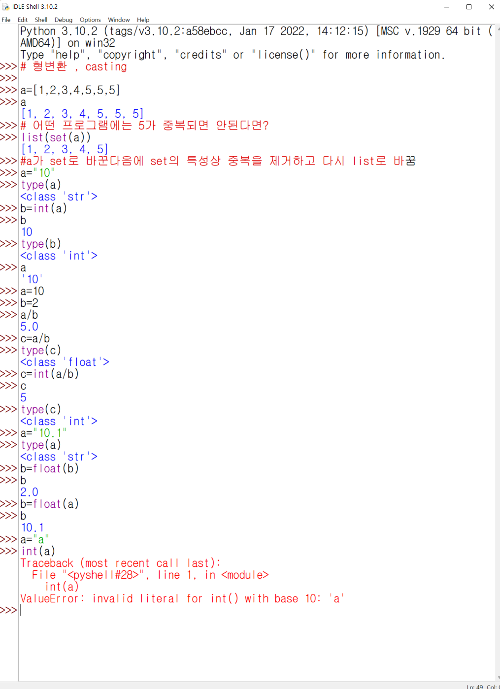 2. 정수형(int), 문자형(str), 실수형(float), 논리형(bool) 등 자료형의 변환을 의미함