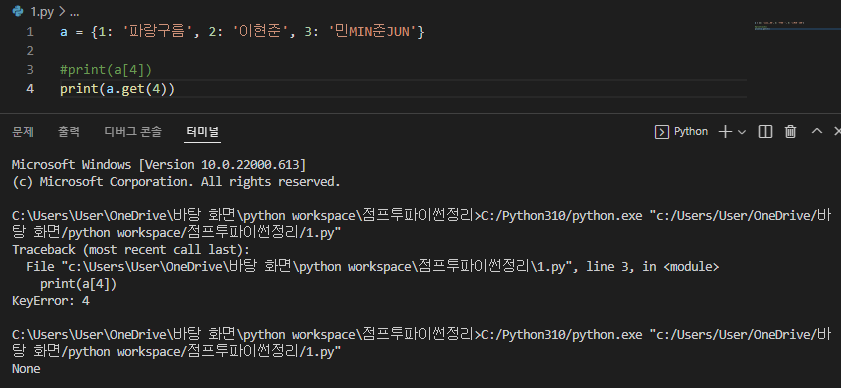 ※ Key를 대괄호에 넣는것 말고 get을 활용하여 Key를 뽑아내는 방법