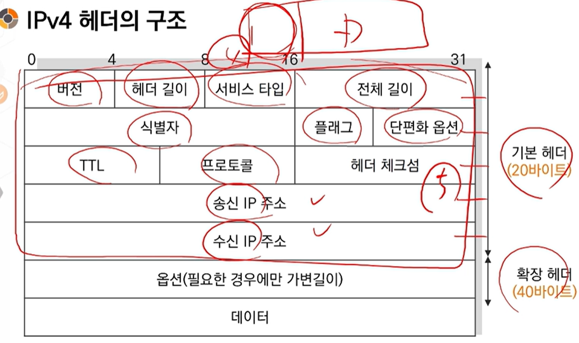 - IPv4는 기본헤더 20바이트 이외에 옵션으로 40바이트 추가 가능!