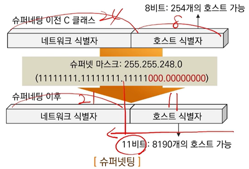 - 특정 클래스의 주소 여러 개를 묶어 좀 더 큰 하나의 네트워크로 구성하는 것