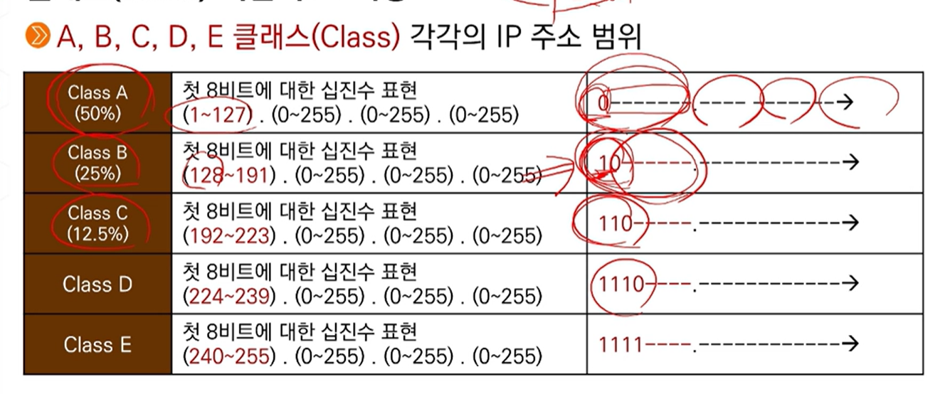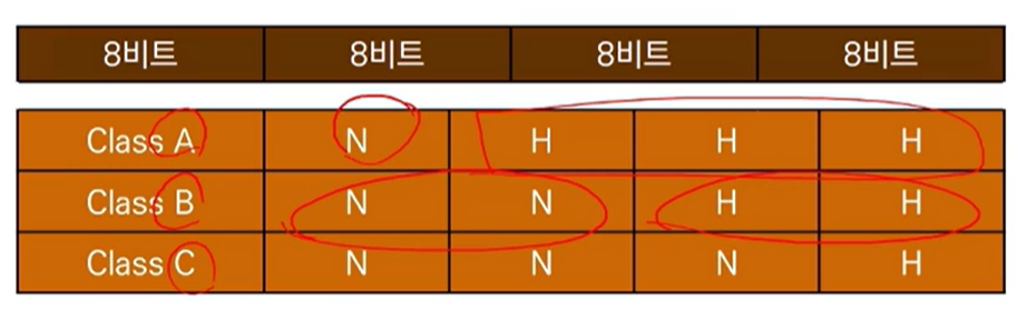 - 32비트를 네트워크주소 // 호스트주소 부분으로 구분