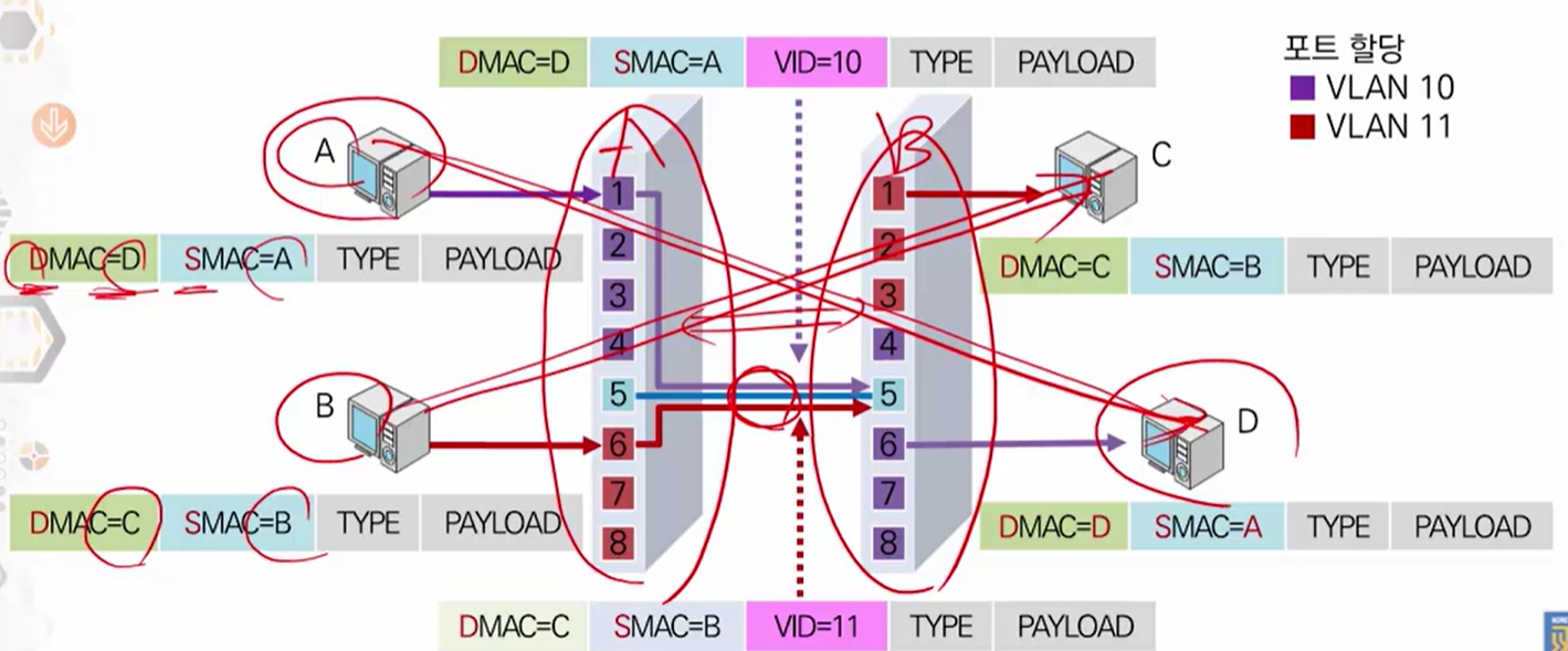 - 이더넷과 ATM LAN 등 혼합 네트워크에서 VLAN이 트렁크 될 수 있음.