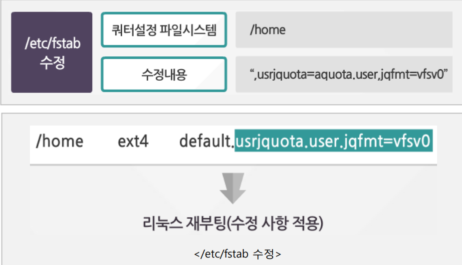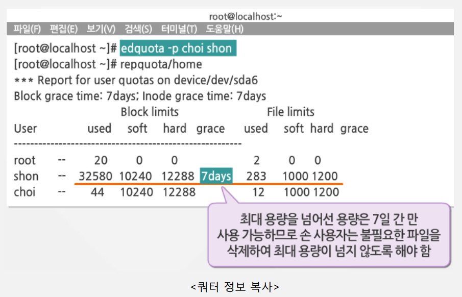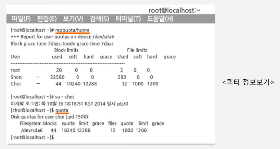 - 모든 사용자 쿼터 정보 보기 : repquota /home