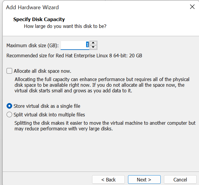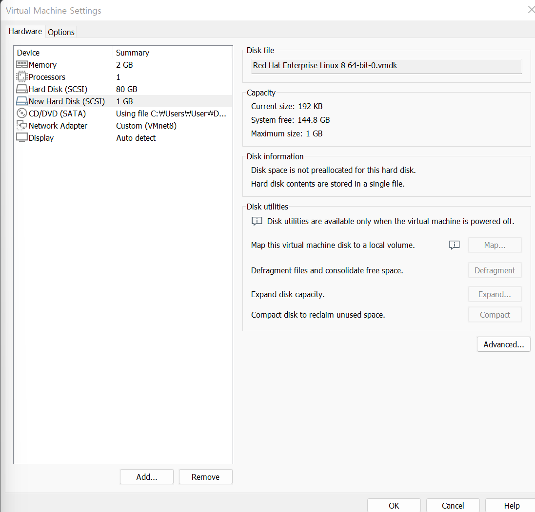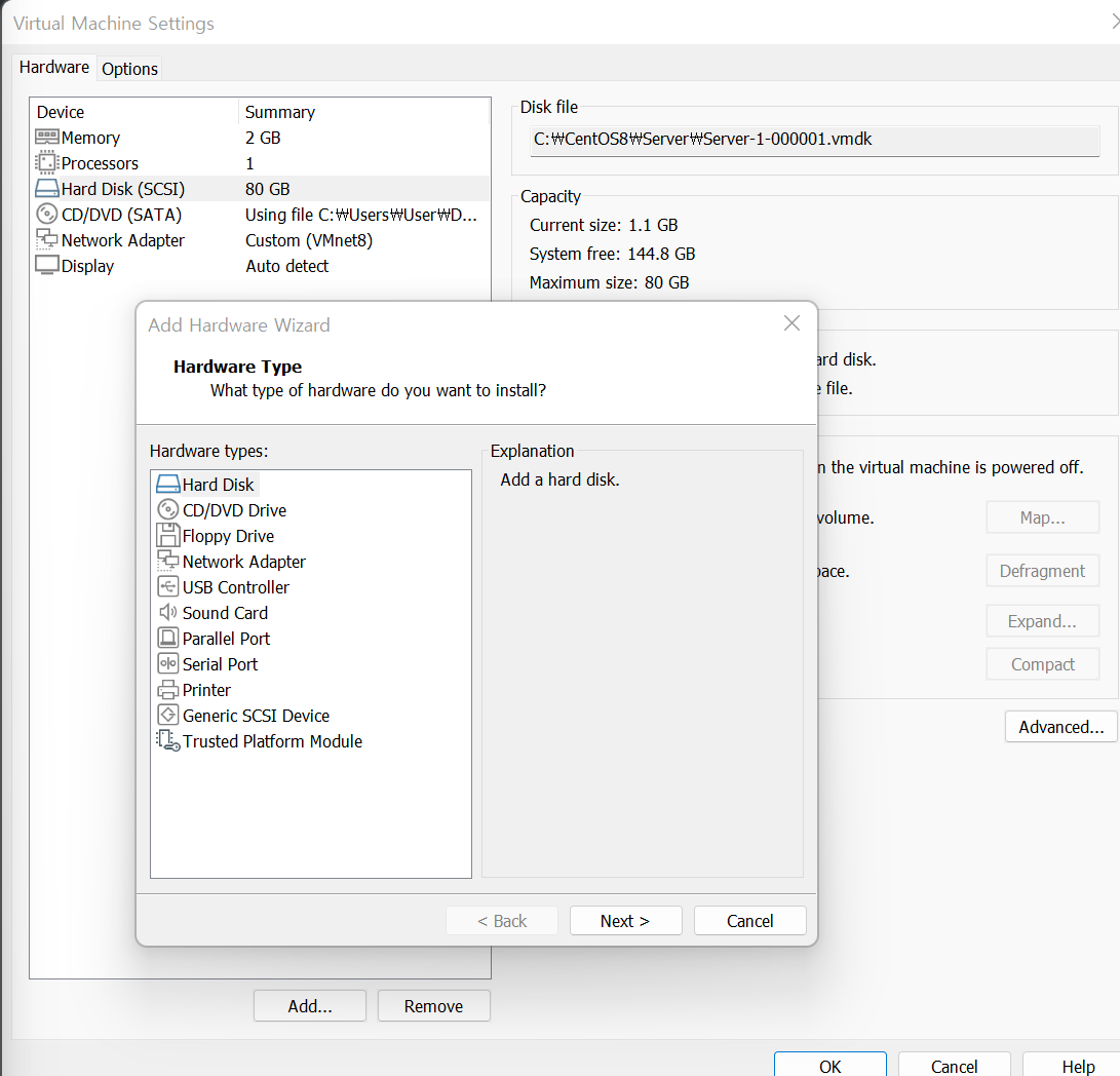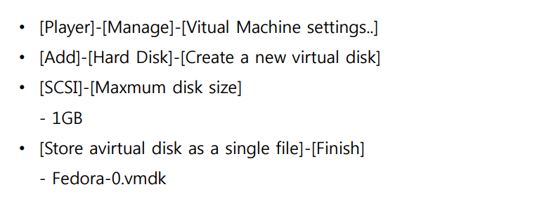 - 실제 서버 컴퓨터에서는 하드 다스크를 서버에 장착하면 되지만, VMWare에서는 설정을 변경함으로써 가능!